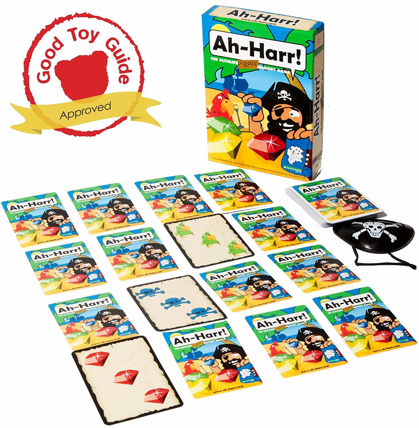 64 Treasure Island cards, pirate captain’s eye patch, rules.